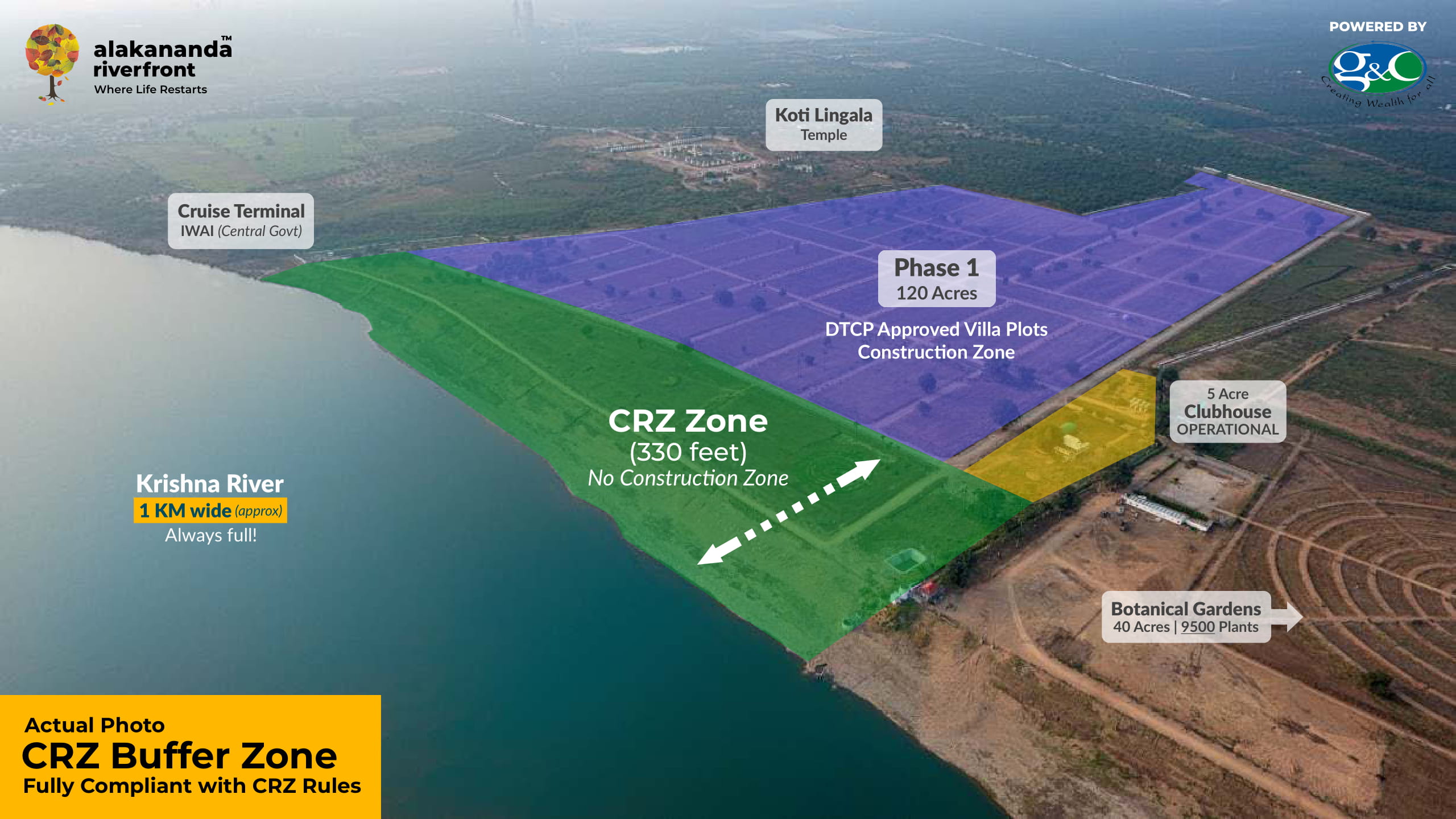 Located on the banks of the Krishna River, ALAKANANDA boasts of a once in a lifetime location cradled by the Krishna and Paleru rivers on two sides and the famous SGS Ashram and Koti Lingala temples on another side.